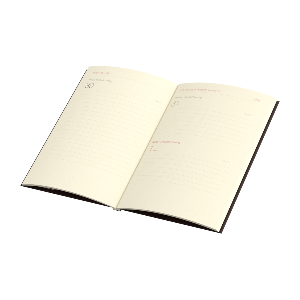 Kalendarium: Wnętrze kalendarza można zaprojektować całkowicie indywidualnie, dostosowując układ dat, sekcje notatek oraz dodatkowe elementy do potrzeb marki. Można również skorzystać z gotowych szablonów kalendariów opracowanych przez Promonotes, które można zmodyfikować i wzbogacić o indywidualną reklamę lub firmowe logo. Blok kalendarza w modelach z serii ORGANIC SPIRIT wykonany jest najczęściej z białego papieru offsetowego w 100% pochodzącego z recyklingu, co zapewnia wysoką jakość i trwałość.