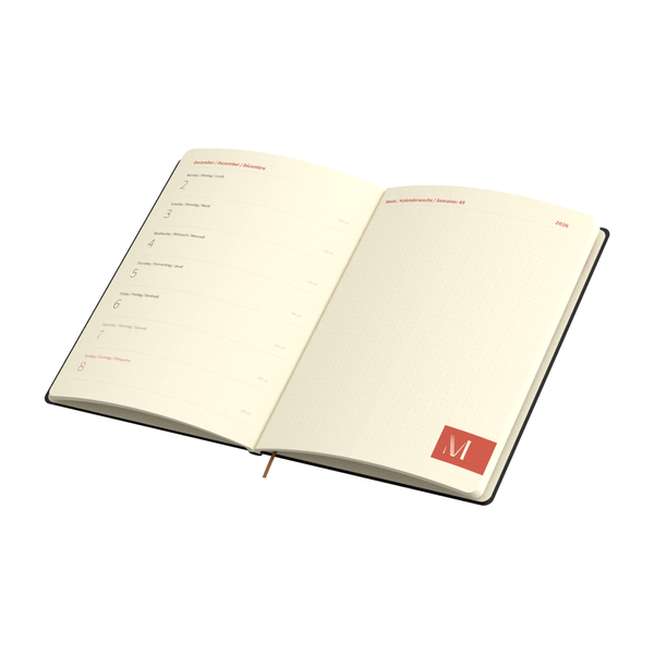 Kalendarium: Wnętrze kalendarza można zaprojektować całkowicie indywidualnie i zgodnie z wymaganiami marki, uwzględniając różne układy dat, sekcje notatek oraz dodatkowe elementy. Można jednak skorzystać z gotowych szablonów kalendariów opracowanych przez Promonotes, które również można dostosować oraz umieścić indywidualną reklamę lub firmowe logo. Blok kalendarza w tym modelu oferowany jest zarówno z papieru z jabłek, jak i z białego papieru offsetowego w 100% pochodzącego z recyklingu. Papier z jabłek zawiera do 15% celulozy z przetwórstwa jabłek, jest biodegradowalny i ma elegancki, kości słoniowej odcień. Papier recyklingowy zapewnia natomiast wysoką jakość i trwałość.