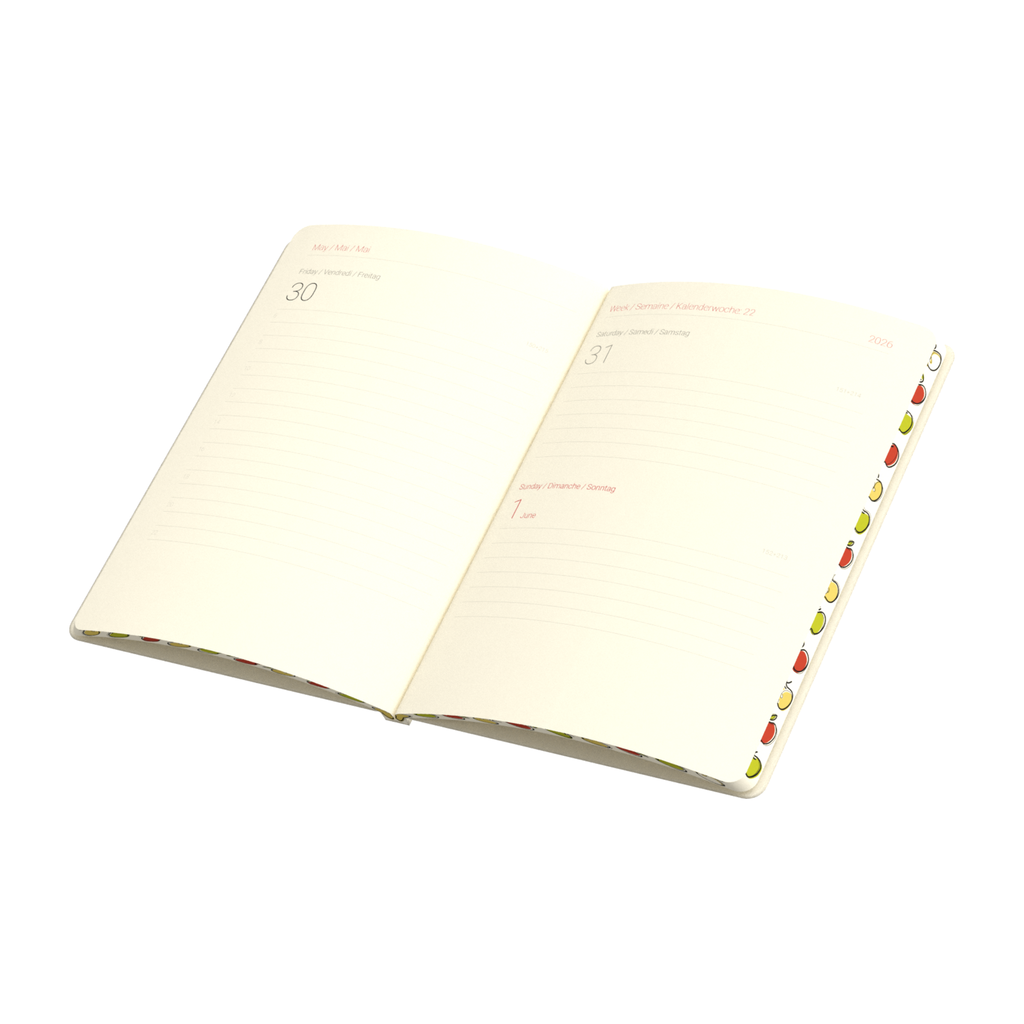 Kalendarium: Wnętrze kalendarza można zaprojektować całkowicie indywidualnie i zgodnie z wymaganiami marki, uwzględniając różne układy dat, sekcje notatek oraz dodatkowe elementy. Można jednak skorzystać z gotowych szablonów kalendariów opracowanych przez Promonotes, które również można dostosować oraz umieścić indywidualną reklamę lub firmowe logo. Blok kalendarza w tym modelu oferowany jest zarówno z papieru z jabłek, jak i z białego papieru offsetowego w 100% pochodzącego z recyklingu. Papier z jabłek zawiera do 15% celulozy z przetwórstwa jabłek, jest biodegradowalny i ma elegancki, kości słoniowej odcień. Papier recyklingowy zapewnia natomiast wysoką jakość i trwałość.