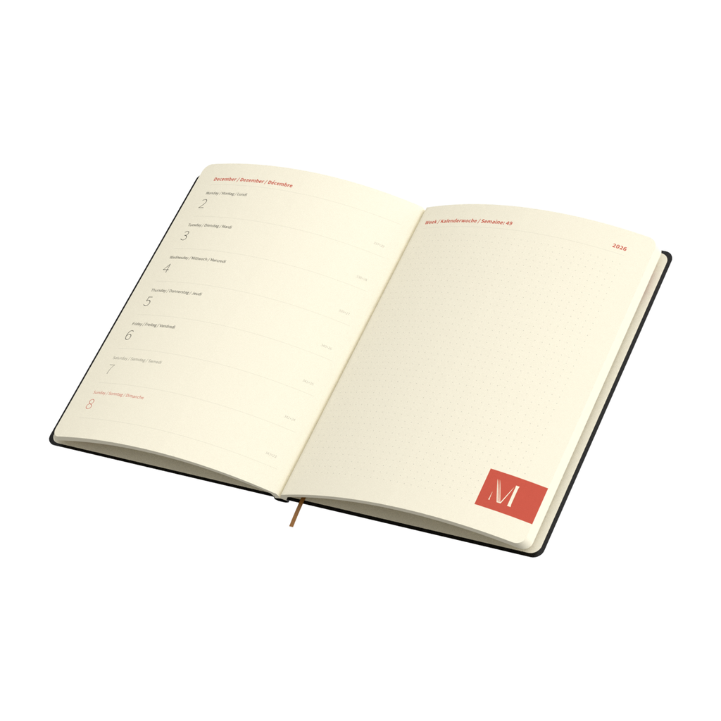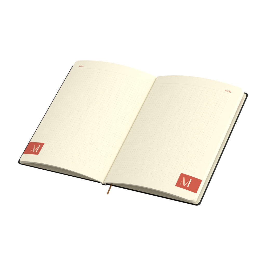 Kalendarium: Wnętrze kalendarza można zaprojektować całkowicie indywidualnie, dostosowując układ dat, sekcje notatek oraz dodatkowe elementy do potrzeb marki. Można również skorzystać z gotowych szablonów kalendariów opracowanych przez Promonotes, które można dostosować oraz wzbogacić o indywidualną reklamę lub firmowe logo. Blok kalendarza w modelu MN22-CAL-SIENA wykonany jest najczęściej z białego papieru offsetowego lub papieru ivory, co zapewnia wysoką jakość i trwałość.