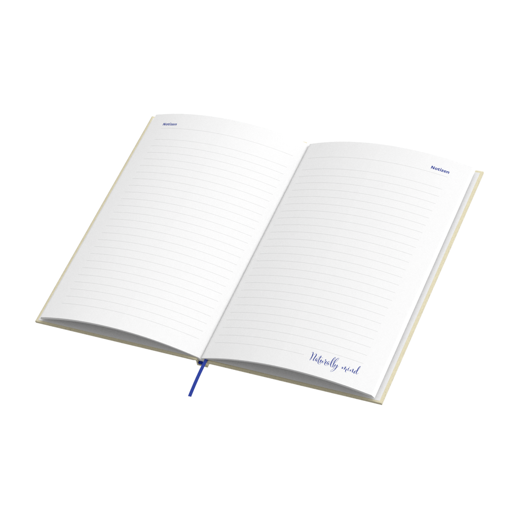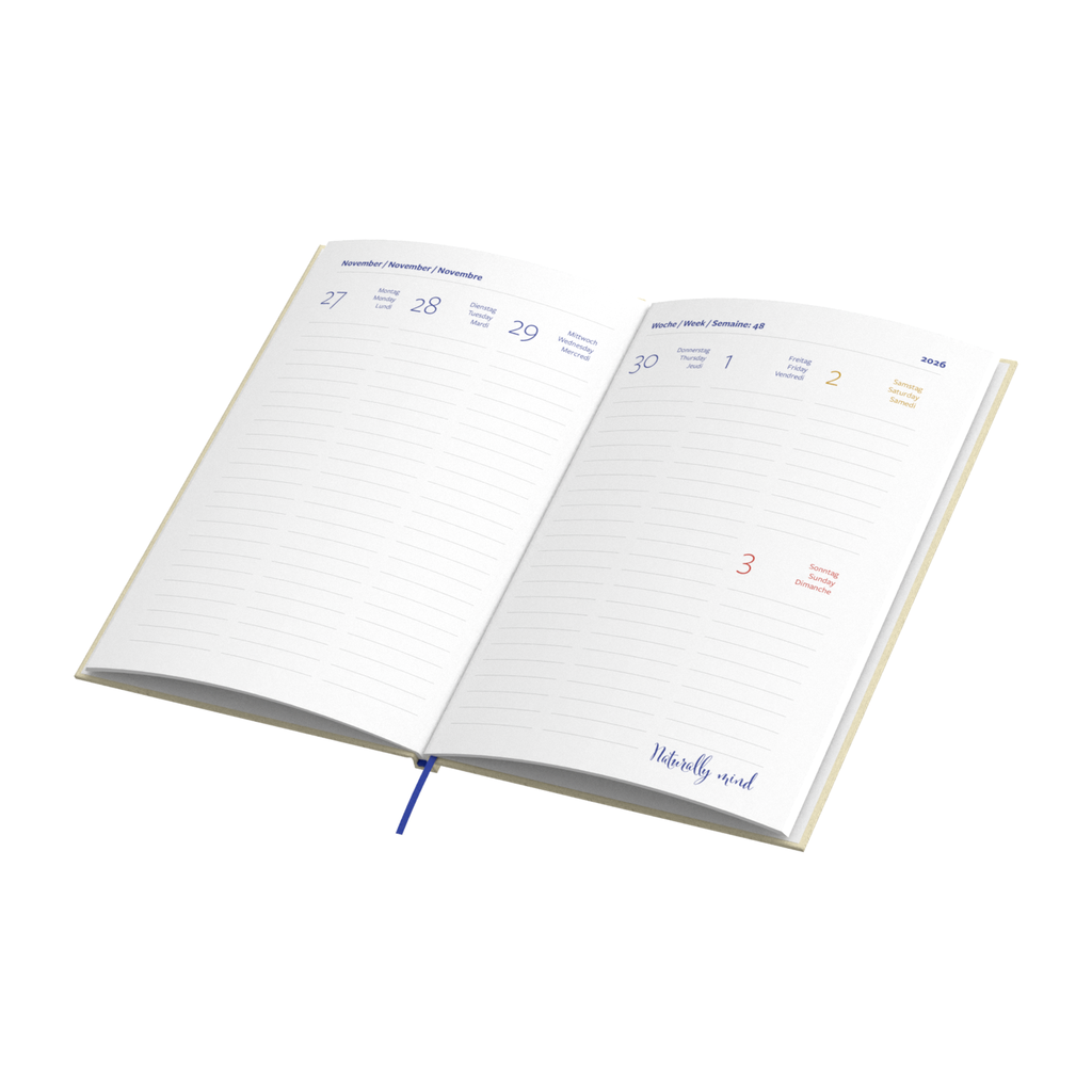 Kalendarium: Wnętrze kalendarza można zaprojektować całkowicie indywidualnie, dostosowując układ dat, sekcje notatek oraz dodatkowe elementy do potrzeb marki. Można również skorzystać z gotowych szablonów kalendariów opracowanych przez Promonotes, które można zmodyfikować i wzbogacić o indywidualną reklamę lub firmowe logo. Blok kalendarza w tym modelu MN31-CAL-GRASS wykonany jest z białego papieru offsetowego w 100% pochodzącego z recyklingu, co zapewnia wysoką jakość i trwałość.