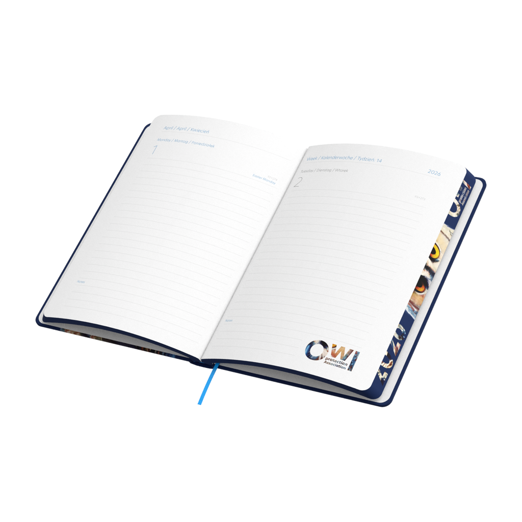 Kalendarium: Wnętrze kalendarza można zaprojektować całkowicie indywidualnie, dostosowując układ dat, sekcje notatek oraz dodatkowe elementy do potrzeb marki. Można również skorzystać z gotowych szablonów kalendariów opracowanych przez Promonotes, które można zmodyfikować i wzbogacić o indywidualną reklamę lub firmowe logo. Blok kalendarza w tym modelu MN31-CAL wykonany jest najczęściej z białego papieru offsetowego lub papieru ivory, co zapewnia wysoką jakość i trwałość.