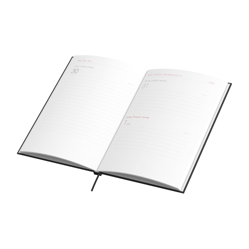 Kalendarium: Wnętrze kalendarza można zaprojektować całkowicie indywidualnie, dostosowując układ dat, sekcje notatek oraz dodatkowe elementy do potrzeb marki. Można również skorzystać z gotowych szablonów kalendariów opracowanych przez Promonotes, które można zmodyfikować oraz wzbogacić o indywidualną reklamę lub firmowe logo. Blok kalendarza w modelu MN35-CAL-MATRYX SANTOS wykonany jest najczęściej z białego papieru offsetowego lub papieru typu ivory, co zapewnia wysoką jakość i trwałość.