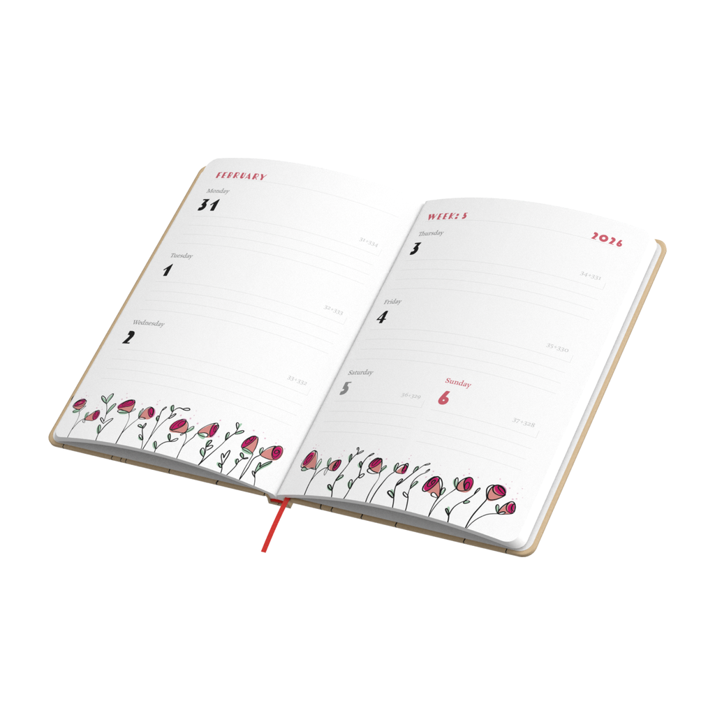 Kalendarium: Wnętrze kalendarza można zaprojektować całkowicie indywidualnie, dostosowując układ dat, sekcje notatek oraz dodatkowe elementy do potrzeb marki. Można również skorzystać z gotowych szablonów kalendariów opracowanych przez Promonotes, które można zmodyfikować i wzbogacić o indywidualną reklamę lub firmowe logo. Blok kalendarza w tym modelu MN36-CAL-KRAFT wykonany jest z białego papieru offsetowego w 100% pochodzącego z recyklingu, co zapewnia wysoką jakość i trwałość.