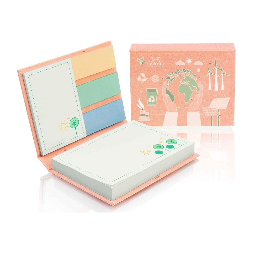 PM100-KRAFT to ekologiczny wariant naszego kultowego zestawu notesów samoprzylepnych, wyprodukowanego przez Promonotes, idealny dla firm, które chcą podkreślić swoje zaangażowanie w ochronę środowiska. W tej wersji twarda okładka wykonana jest z papieru typu Kraft, stworzonego w 100% z recyklingowanych włókien, co nadaje produktowi naturalny, surowy charakter.