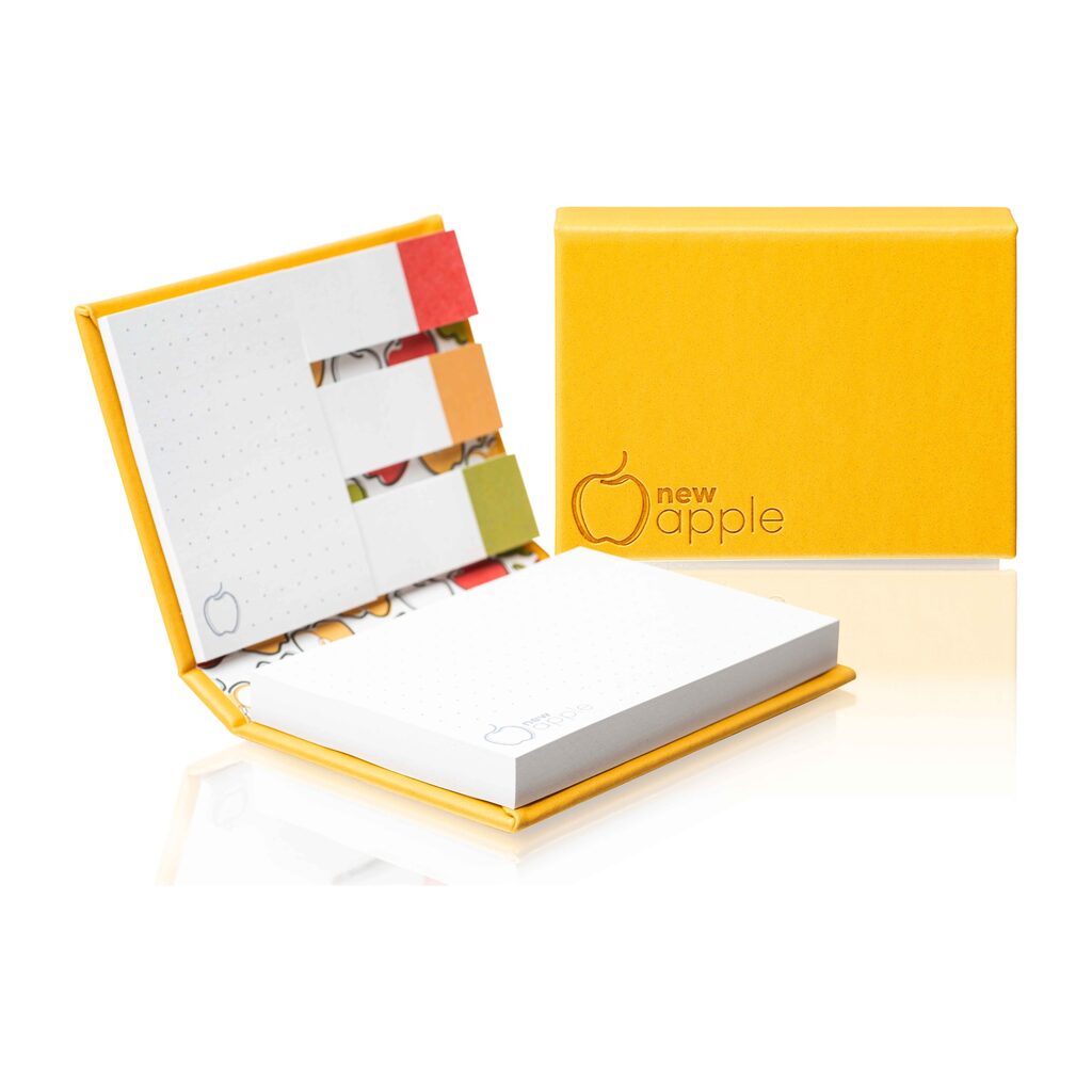 Wewnątrz zestawu PM100-NEWAPPLE najczęściej znajdują się dwa notesy samoprzylepne i papierowe znaczniki indeksujące, wykonane z papieru NEWAPPLE. Istnieje również możliwość zastosowania białego papieru oraz kolorowych znaczników indeksujących, w obu przypadkach w 100% pochodzących z recyklingu.