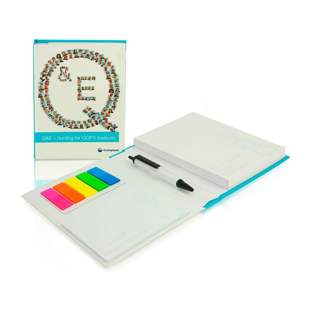 PM113 to wszechstronny zestaw, który łączy w sobie różne funkcjonalności w twardej, książkowej okładce. Zestaw składa się z jednego tradycyjnego notesu klejonego na grzbiecie, jednego notesu samoprzylepnego oraz znaczników indeksujących PET. Dodatkowo, w skład tego zestawu wchodzi mały plastikowy uchwyt na długopis wraz z długopisem, co sprawia, że PM113 jest kompletnym narzędziem do codziennego użytku.