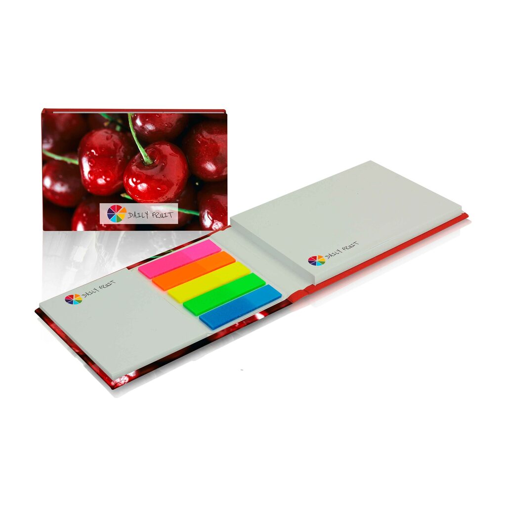 Zestaw PM136 składa się z dwóch notesów samoprzylepnych oraz znaczników indeksujących typu PET, umieszczonych w twardej, książkowej oprawie. Twarda okładka, zazwyczaj laminowana i pokrywana zadrukowanym papierem kredowym, może być wykańczana różnymi foliami – błyszczącą lub matową, przy czym matowa folia jest odporna na zarysowania, co zapewnia długotrwały efekt estetyczny.