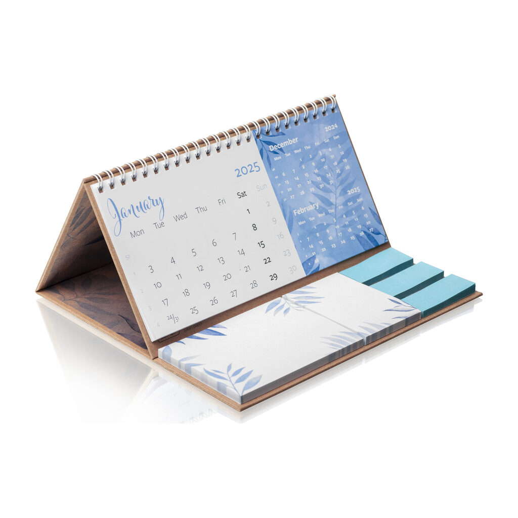 Ten model kalendarza zawiera dwa notesy samoprzylepne, wykonane z białego papieru pochodzącego w 100% z recyklingu, oraz kolorowe papierowe znaczniki indeksujące, również wykonane z materiałów z recyklingu. Dodatkowo, papier użyty do wykonania kartek kalendarium jest w pełni ekologiczny.