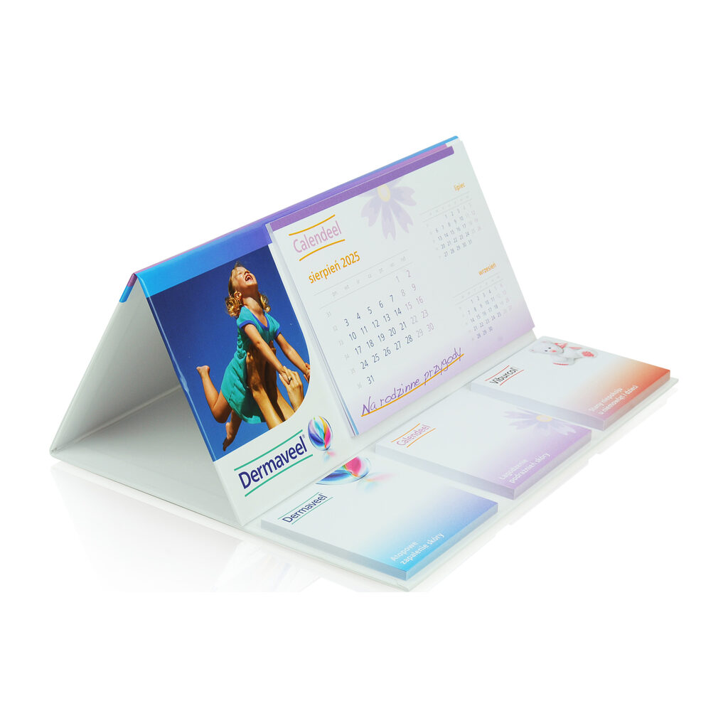 Ten model kalendarza składa się z aż trzech notesów samoprzylepnych oraz co najmniej 12 kartek kalendarza, co czyni go niezwykle funkcjonalnym. Twarda podstawa kalendarza oferuje szerokie możliwości zadruku, co pozwala na pełną personalizację i dopasowanie do potrzeb Twojej marki. Dzięki temu kalendarz nie tylko spełnia swoją rolę praktycznego narzędzia, ale również skutecznie promuje Twoją firmę przez cały rok.