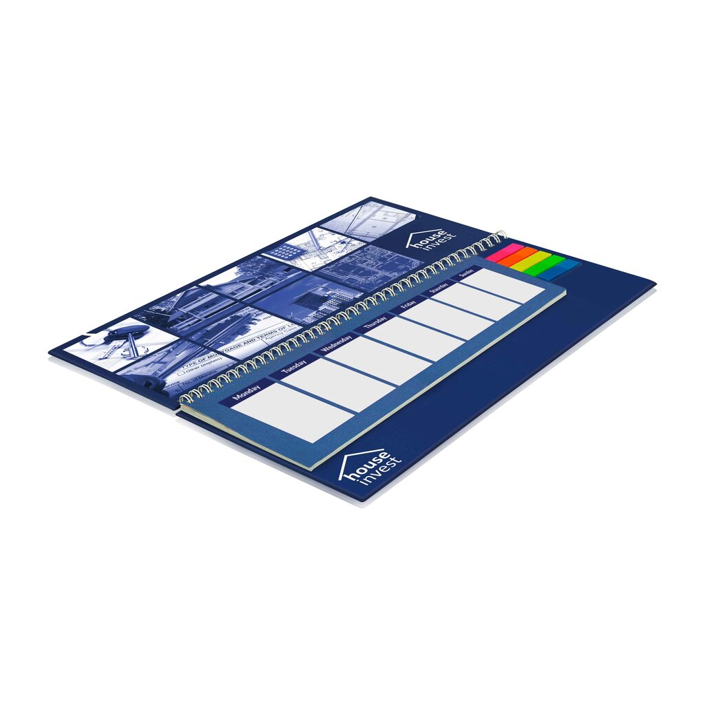 Ten kalendarz biurkowy wyróżnia się wewnętrznie wbudowaną spiralą, co sprawia, że jest wyjątkowo wygodny w użyciu i pozwala na oszczędzenie miejsca na biurku. Dzięki tej konstrukcji na spirali mogą znaleźć się aż 52 kartki, co daje możliwość zaprojektowania indywidualnego, tygodniowego kalendarium.